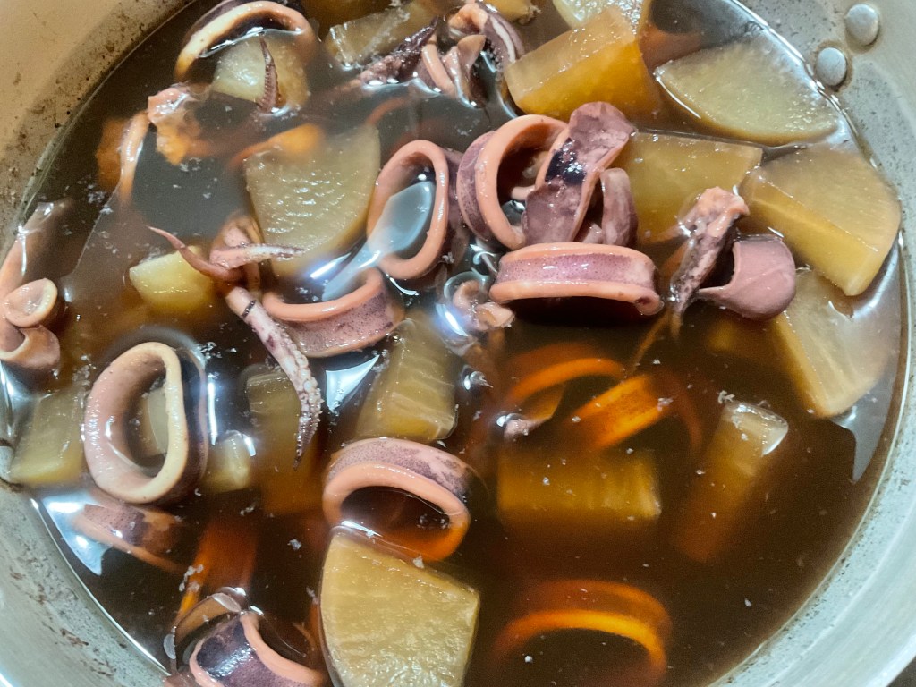 今日はイカ大根、レバニラ炒め、カボチャの煮付け、キュウリとカニ風味の辛子マヨ和え、生ちくわのツナチーズ焼きなどございます。