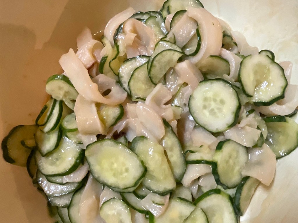 今日はクリームシチュー、長芋の浅漬け、手羽先の甘辛煮、茎わかめとエノキときゅうりの中華和え、サラ玉と生ハムのサラダ、レバニラ炒め、ほうれん草のナムルなどございます。