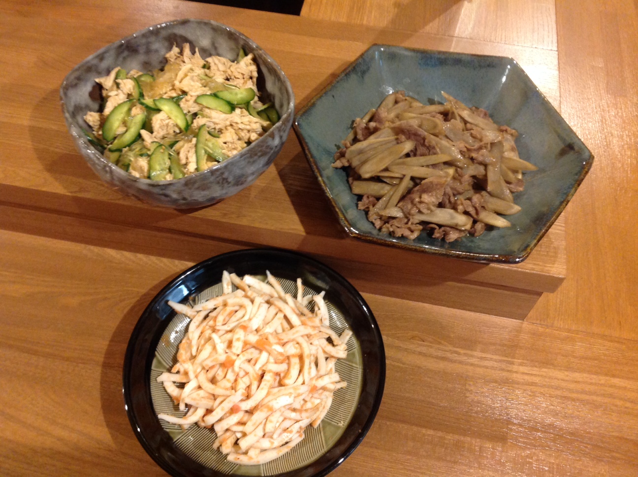 今日は、ピーマンとベーコンの春巻き、牛肉とゴボウのしぐれ煮、春雨とササミのサラダ、イカのタラコ和えです。