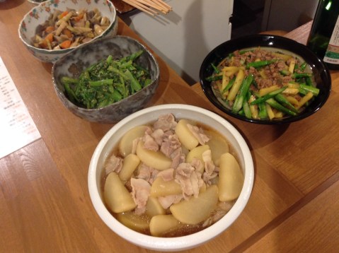 さて今日は、鶏胸肉の醤油煮、マカロニサラダ、アイヌネギとイカの酢味噌和え、大根と豚バラ肉の煮物、新玉ねぎとウインナーの串カツです!