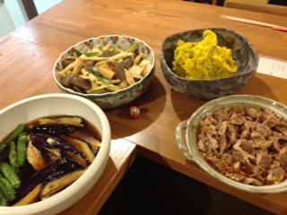 さて今日は、ピーマンの肉詰め、厚揚げとこんにゃくとたけのこの煮物、ナスとシシトウの揚げ浸し、かぼちゃのサラダ、野菜天ぷら盛り合わせなどなどございます。