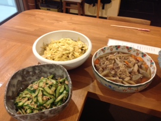 今日の日替わりは、たけのこの卵とじ、ごぼうと牛肉の煮物、ブロッコリーとベーコンのサラダ、きゅうりとシーチキンの和え物、かぼちゃコロッケなどなどございます。