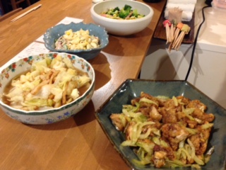 さて今日は、真ガレイの煮付け、豚モモ肉のカラシ揚げ、セロリと鳥唐揚げのマヨネーズ炒め、キャベツの油炒め、マカロニサラダなどでございます。