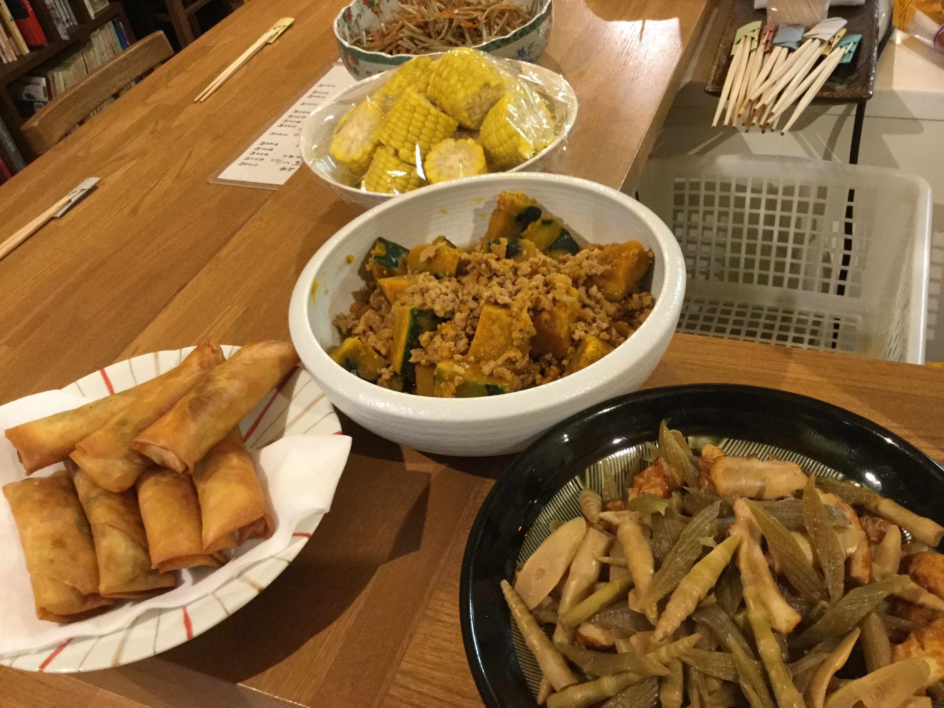 さて今日は、かぼちゃのそぼろ煮、フキとタケノコの煮物、きんぴらごぼう、ブロッコリーとベーコンのマヨネーズ和え、煮卵、キャベツの浅漬け、水菜と長芋の和え物などでございます。