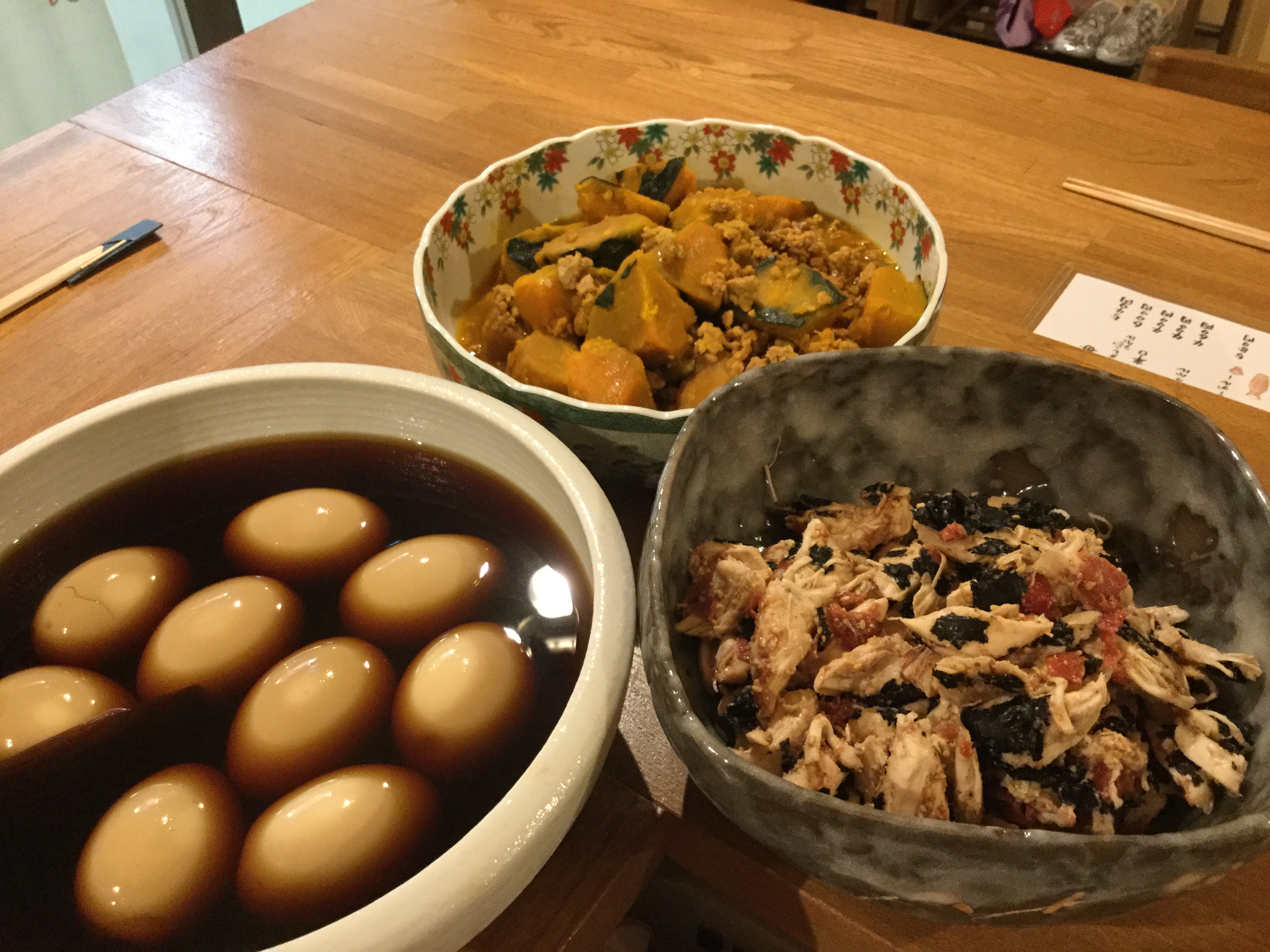 さて今日は、アサリの酒蒸し、油揚げの含め煮、かぼちゃのそぼろ煮、ブロッコリーとベーコンのマヨネーズ和え、煮卵、鶏ささみの梅海苔和えなどでございます。