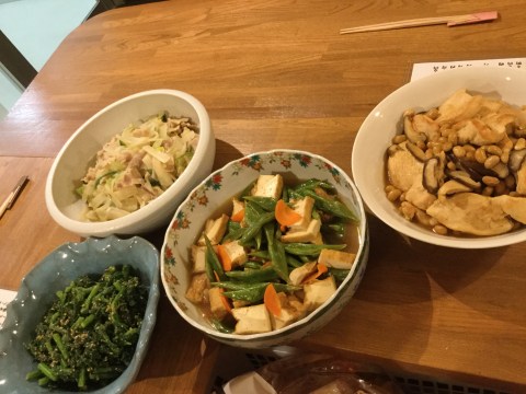 さて今日は、豚肉の生姜焼き、レタスのツナサラダ、鶏胸肉と大豆の甘酢煮、大根と豚ばら肉の味噌煮、ささぎと厚揚げの煮物、春菊の胡麻和えなどでございます。