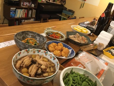 さて今日は、手作りシュウマイ、豚肉の生姜焼き、ナス・カボチャ・パプリカの揚げ浸し、マカロニサラダ、小松菜の胡麻和え、キャベツの浅漬け、手羽元の甘栗煮などでございます。
