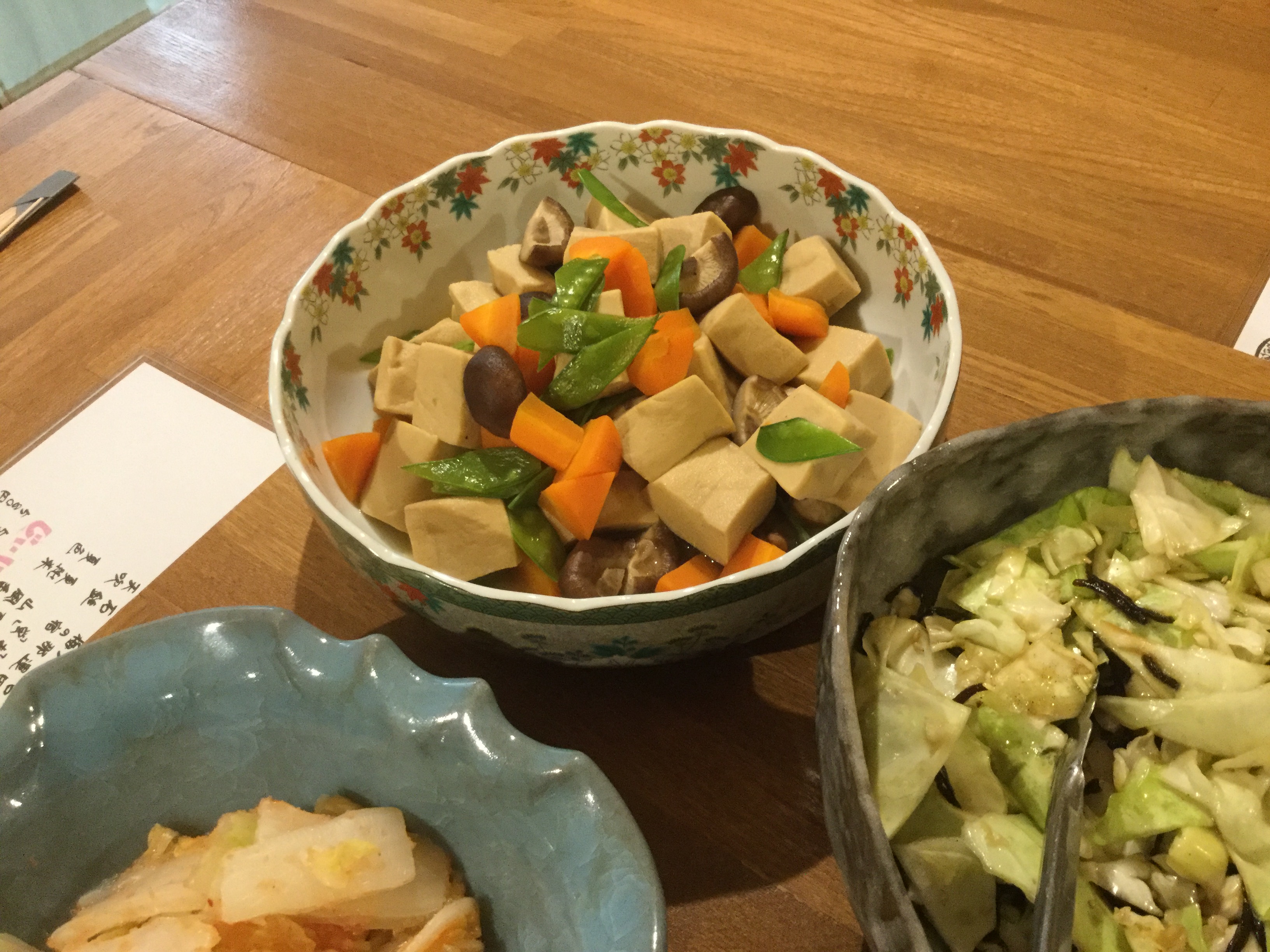 さて今日は、カスベの唐揚げ、高野豆腐の煮物、揚げ納豆、白菜の明太子和え、キャベツの塩昆布和え、梅しそささみなどでございます。