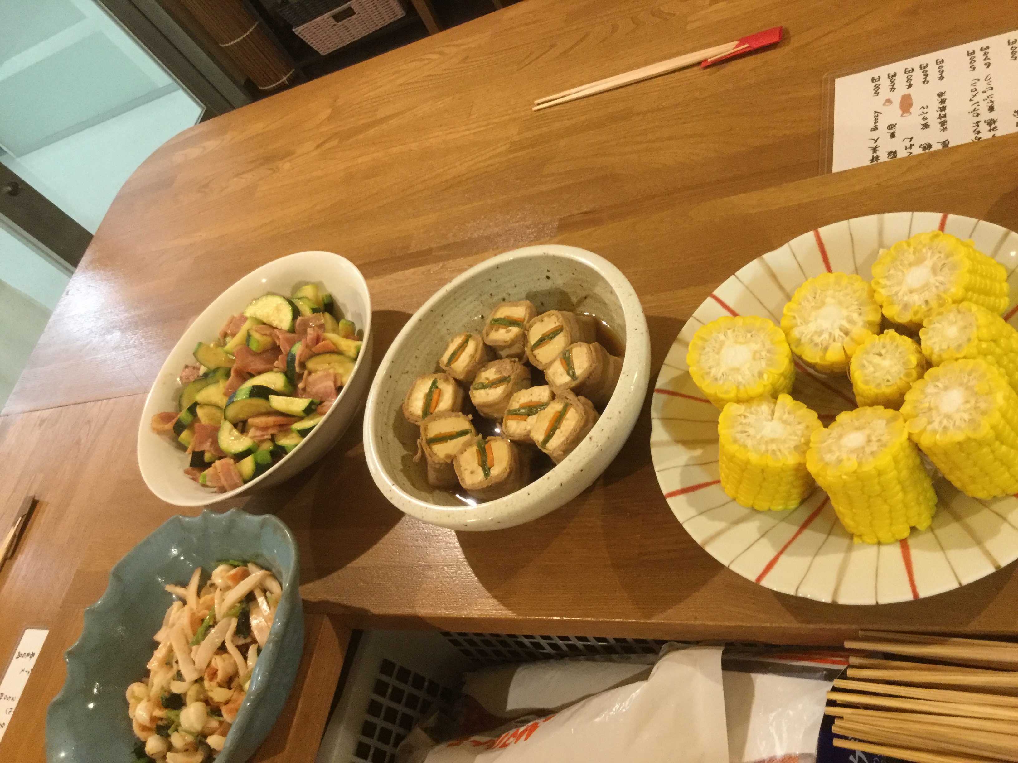 さて今日は、手作り春巻き、エビフライ、厚揚げの肉巻き、ユリ根とかまぼこの明太子和え、人参の山クラゲ和え、ズッキーニのベーコン炒め、ニラのおひたしなどでございます。