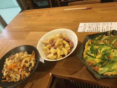 さて今日は、チキンカツの卵とじ、レンコンと豚肉のきんぴら、春雨サラダ、ジャガイモとウインナーのチーズ炒め、ニラチヂミ、生ちくわの天ぷらなどでございます。