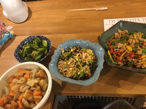 さて今日は、小アジのフライ、ピーマンと豚肉の中華炒め、はんぺんチーズフライ、秋刀魚の塩焼き、豆もやしの中華サラダ、根菜と生ちくわの煮物などでございます。