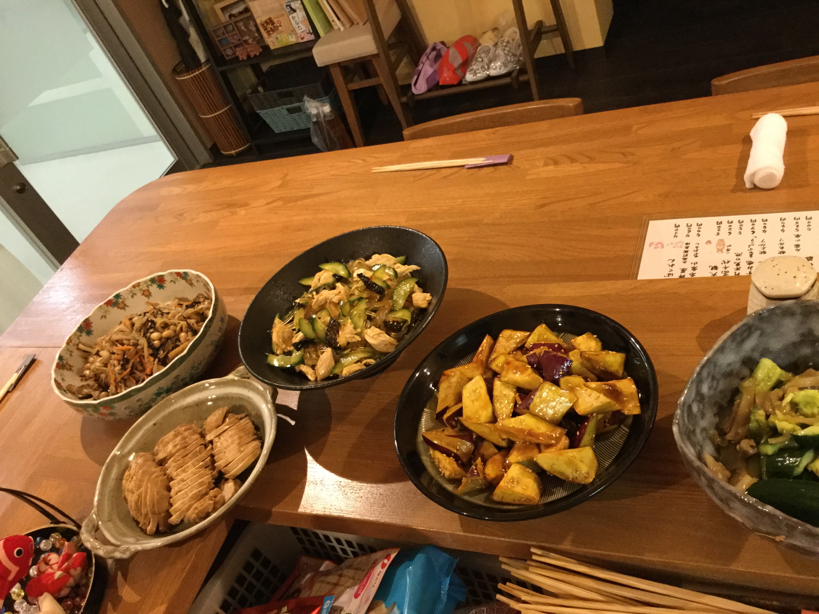 さて今日は、秋の味覚の天ぷら盛り、鶏チャーシュー、大学芋、ジャガイモと玉子の甘煮、切り干し大根の煮物、たたきキュウリのザーサイ和えなどでございます。