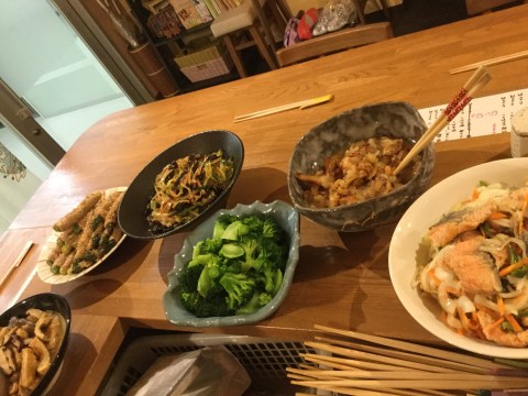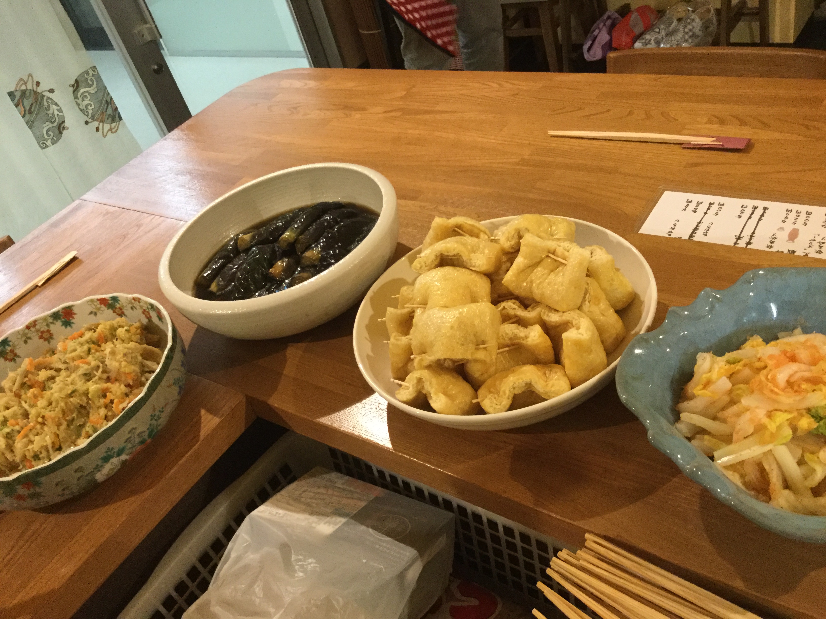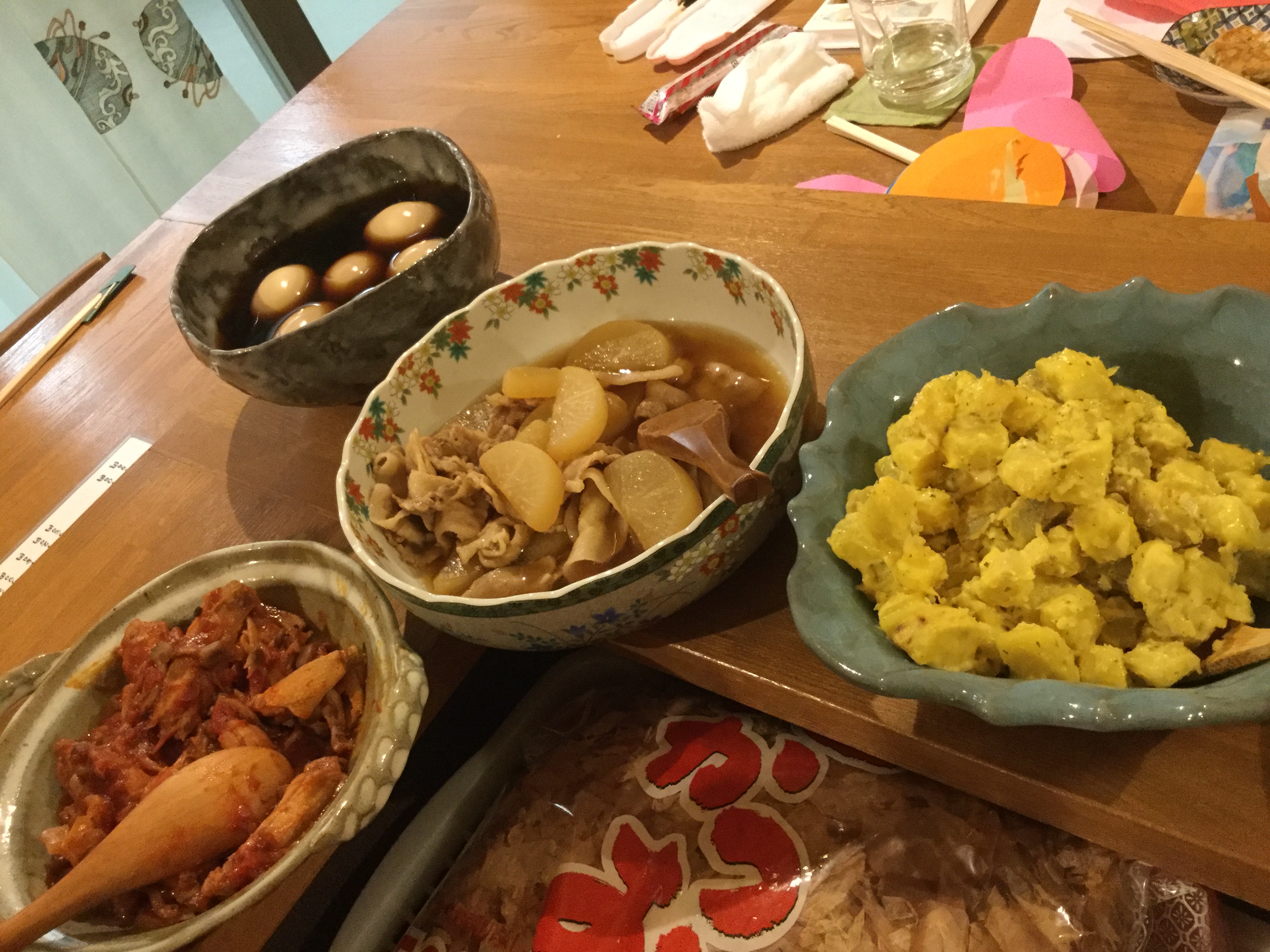 さて今日は、ベーコンチキンカツ、マスのマリネ、ブロッコリーのツナサラダ、ナスの揚げ浸し、レンコンのはさみ揚げ、大学芋などでございます。