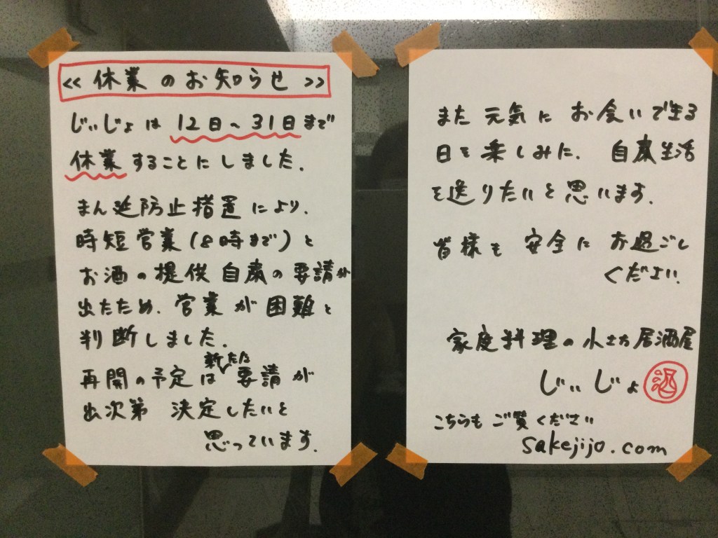 となると、営業自体が困難となるため、残念ながらじぃじょは31日まで休業することになりました。