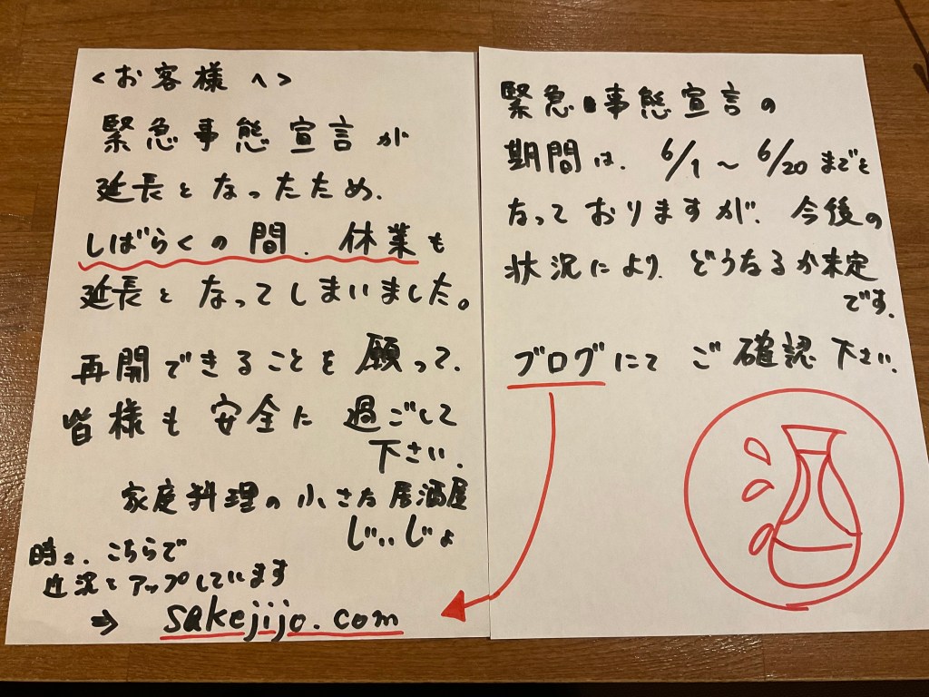 当初の休みは31日までの予定でしたが、緊急事態宣言の延長により、その期間は休業となります。