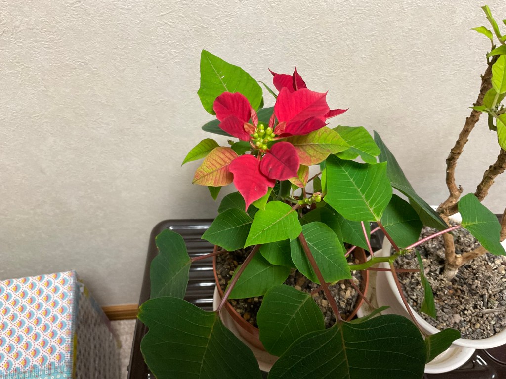 青々と元気に育っていたのですが、今年こそはクリスマスに赤くしてやろうと、光を制限して育ててきました。