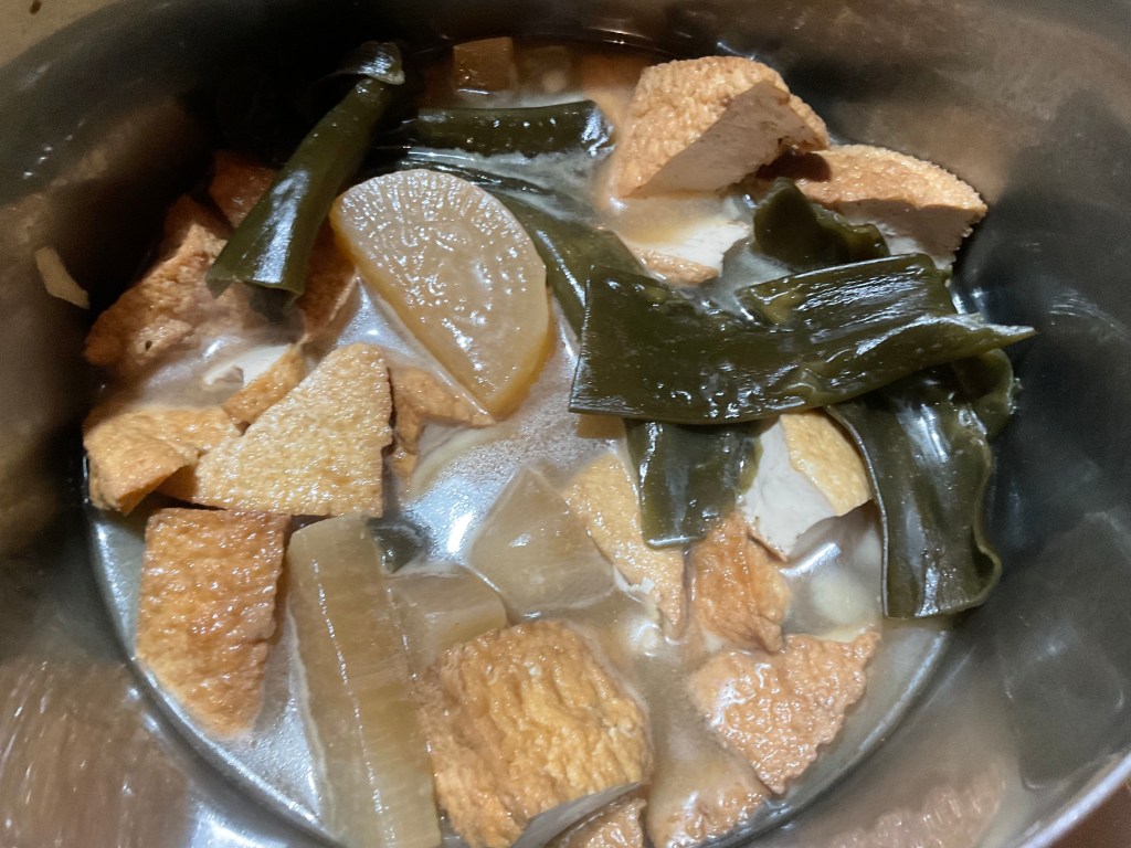 今日はキムチ鶏団子汁、大根と厚揚げの煮物、お麩じゃが、きゅうりとかに風味の辛子マヨ和え、ほうれん草のおひたしなどなどございます。
