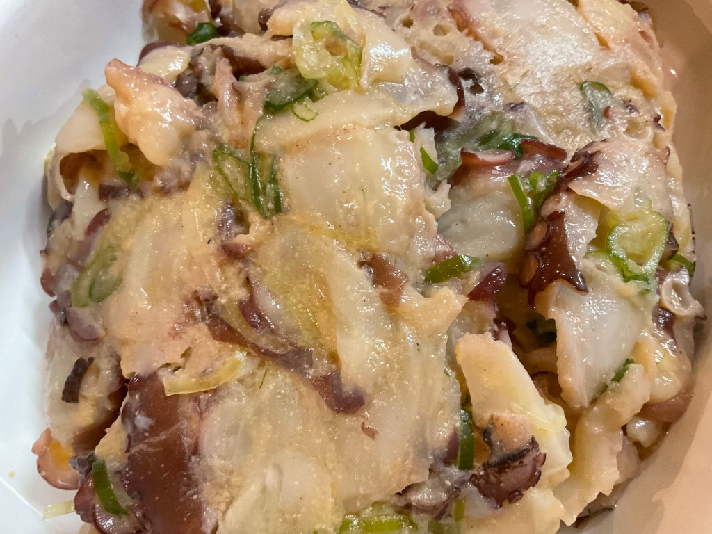 今日は芋もちコロッケ、焼きそば、温泉たまご、タコの酢味噌和え、きんぴらごぼう、きゅうりのビール漬けなどございます。