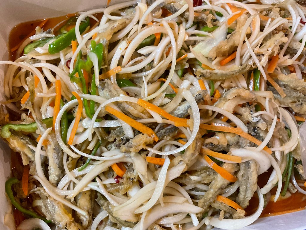 今日はワカサギとたっぷり野菜の南蛮漬け、ガンモと小松菜の塩煮、ニシンと大根の煮付け、茎わかめの麺つゆ漬け、キャベツときゅうりの浅漬け、カレーなどございます。