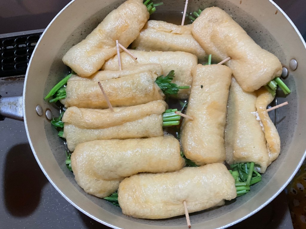 今日はトンカツ、茹でアスパラ、きゅうりの生姜醤油漬け、三つ葉とかまぼこのとびっこ和え、豆もやしのナムル、セリの油揚げ包み煮などございます。