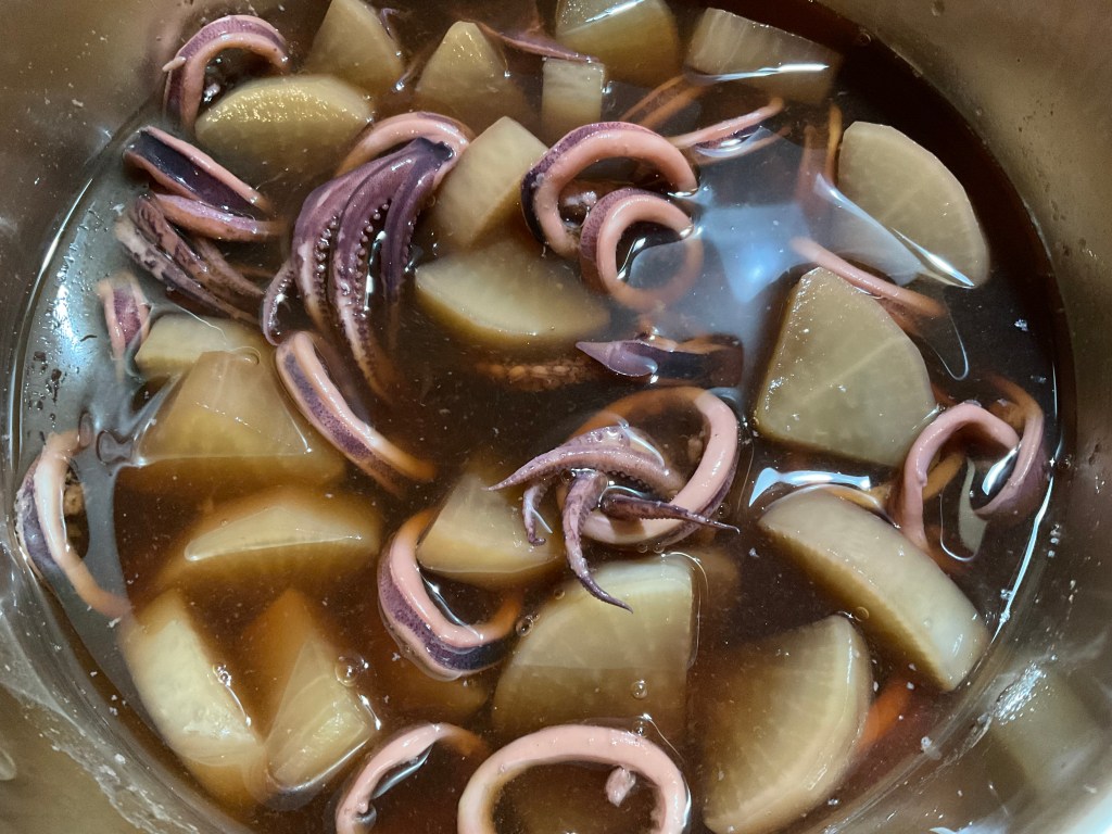今日はイカ大根、手羽元の甘辛煮、春雨サラダ、サツマイモの塩バターチーズ和え、色々煮物、キノコと昆布の佃煮などございます。