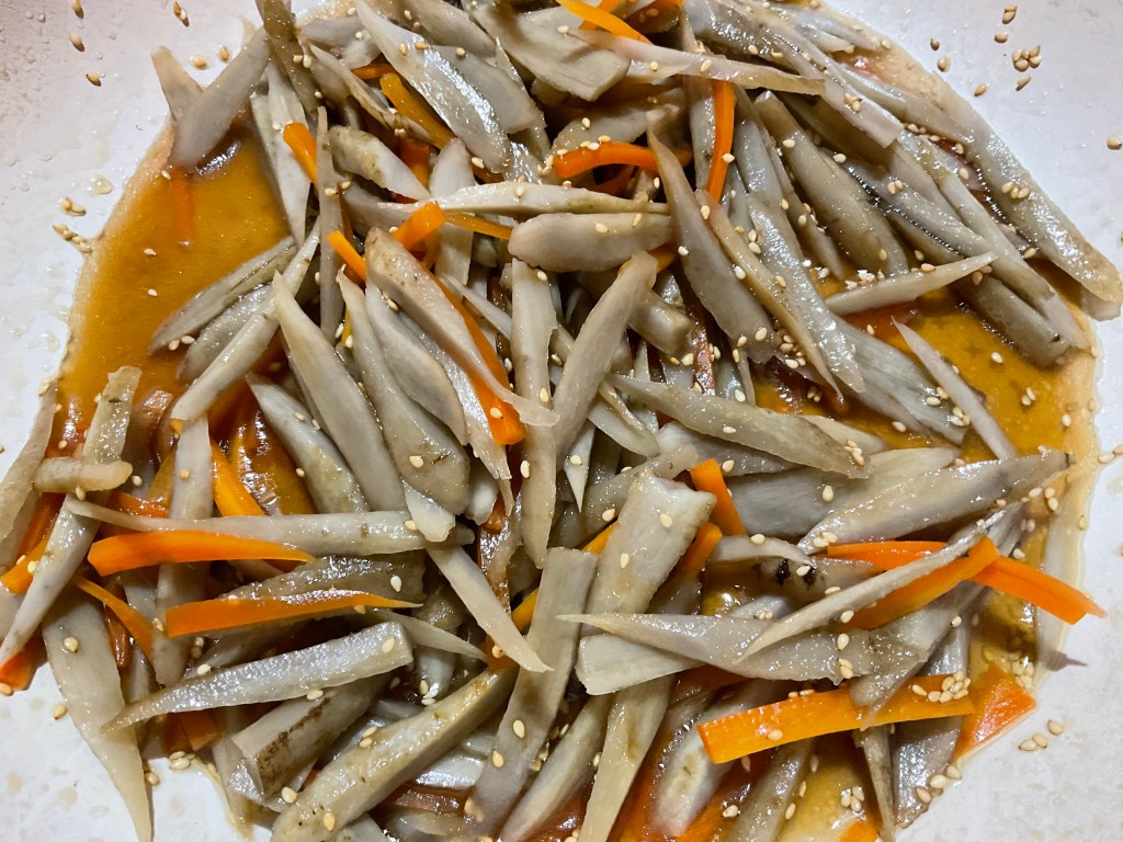 今日は手羽元と大根の塩煮、きんぴらごぼう、ジャガイモとちくわときゅうりのサラダ、豆もやしのナムル、豆腐と豚肉と揚げナスのお味噌汁などございます。