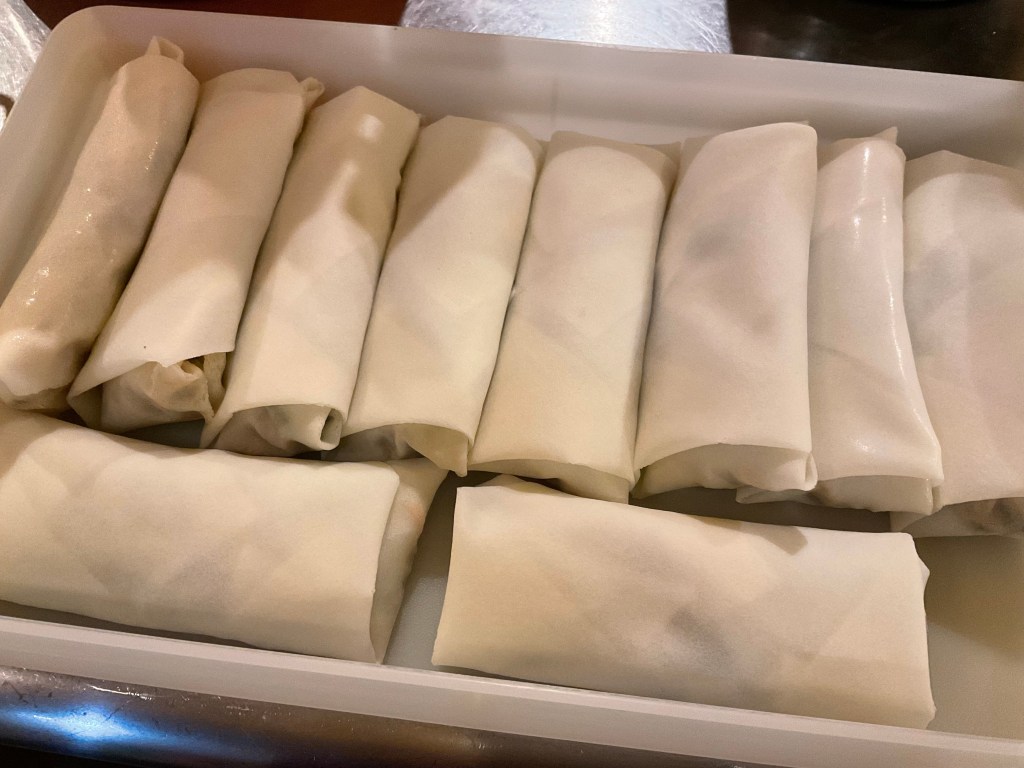 今日は手作り春巻き、厚揚げ焼きネギじゃこのせ、焼きビーフン、ナス焼き、ネギと油揚げの塩煮、レタスとアスパラのツナサラダなどございます。